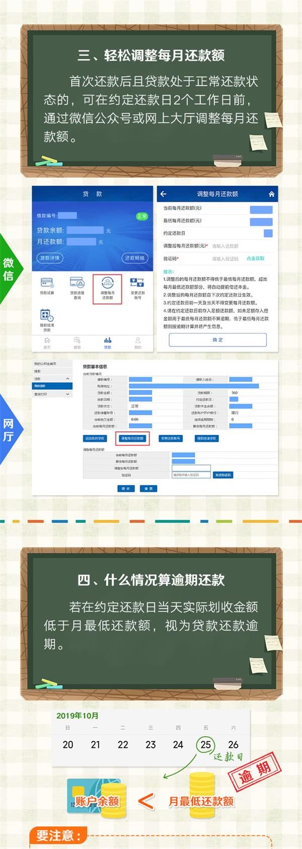 一:每个月的还款日。 还款日为贷款发放日的次月的对应日。比如9月25日发放贷款,还款日为10月25日。 需要注意的是:没有对应日的,当月最后一日为还款日。 还款日遇到节假日的,实际扣划日期顺延。 二、保证还款账户余额充足,且不低于月最低还款额。 三、可以通过网厅或者微信公众好进行调节每月的还款额。 四、尽量不要账户低于最低还款额,不过公积金中心提供四天免罚息,若超过免罚期偿还逾期款项的,罚息从逾期当日开始计算。 以上四点,您记住了吗?主要就是记住还款日期、保持还款账户余额充足或保证有最低还款额,如果经济上有富裕可以调整还款金额,如果不充足则要充分利用好四天的免罚期,尽量不要逾期。